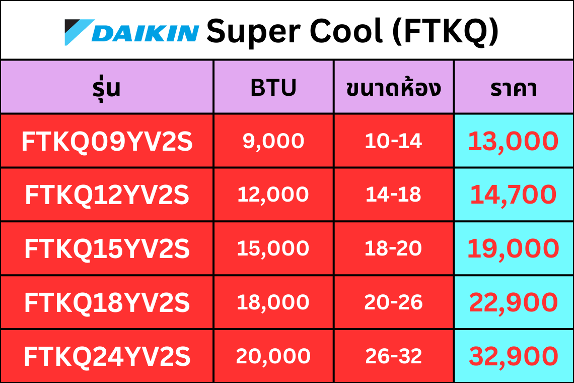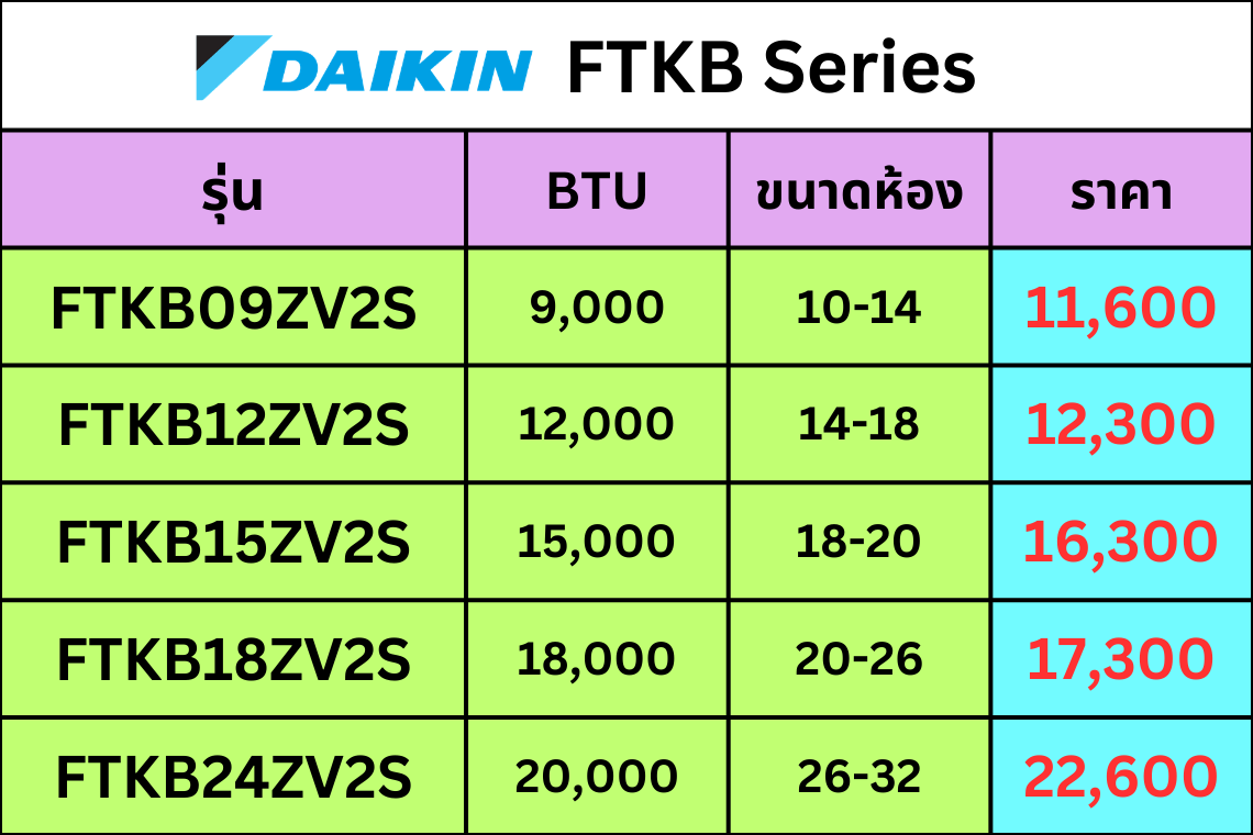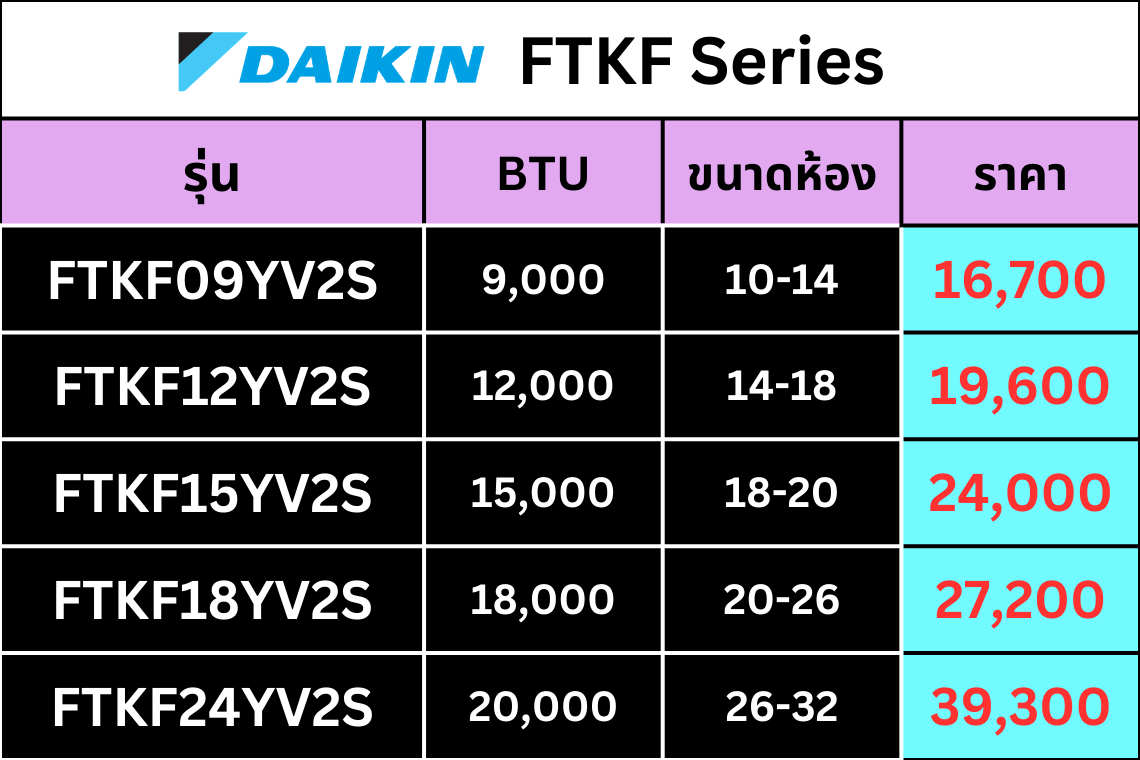 ถ้าต้องการคุ้มค่าใช้งานทั่วไป เริ่มดู FTKB/FTKF/FTKQ ก่อน ถ้าเน้นสบาย เงียบ ฟีเจอร์แน่นขึ้น ขยับไป FTKM/FTKZ และอย่าลืม: เลือก BTU ให้พอดีห้อง = คุ้มสุดทั้งค่าไฟและความสบาย